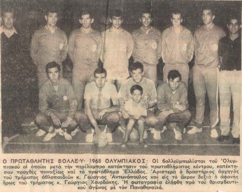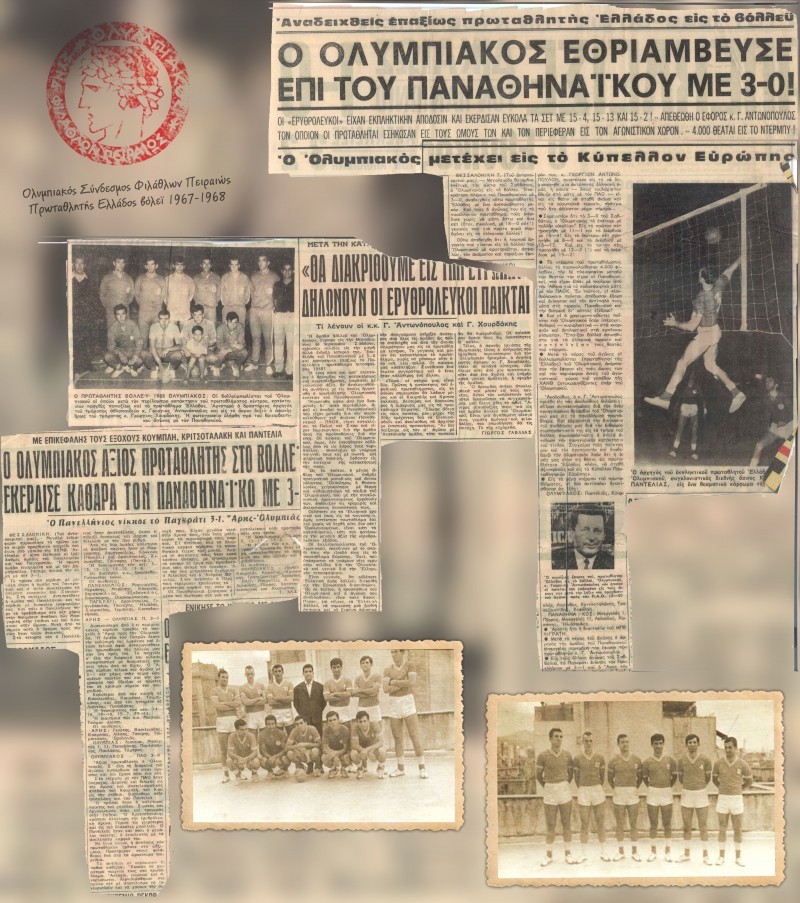 «Κατακτήσαμε το πρωτάθλημα κέντρου. Είχαμε κερδίσει τον Παναθηναϊκό και μάλιστα επειδή δεν υπήρχαν πολλά κλειστά γήπεδα, όταν γινόταν η κλήρωση, λέγαμε να παίξουμε και τα δύο παιχνίδια στο γήπεδο του Παναθηναϊκού. Τότε βέβαια ερχόντουσαν και οι φίλαθλοι του Ολυμπιακού. Εμείς τότε, ήμασταν μια παρέα από τον Κολωνό και μικροί οι περισσότεροι,. Παίρναμε τρεις συγκοινωνίες για να πάμε να προπονηθούμε στον Πειραιά και μετά να πάμε στα σχολεία μας. Μεγάλος μας αντίπαλος ήταν ο παναθηναϊκός τον οποίο τις περισσότερες φορές τον κερδίζαμε. Την εποχή δεν υπήρχε και η τηλεόραση και δεν υπήρχαν και τα τωρινά μέσα να προβάλουν τις επιτυχίες μας. Δεν είχαμε εξάλλου τις προϋποθέσεις να προπονηθούμε καλύτερα μιας και ήταν δύσκολα τα χρόνια τότε. Είμαστε υπερήφανοι που φτάσαμε με τις τότε συνθήκες να καταστήσουμε το πρωτάθλημα τον Ολυμπιακό μας, την αγάπη μας. Γιατί όλοι είμαστε φανατικοί Ολυμπιακοί πάνω απ’ όλα και αναδείξαμε το κλαμπ κατ’ επανάληψη πρωταθλητή».