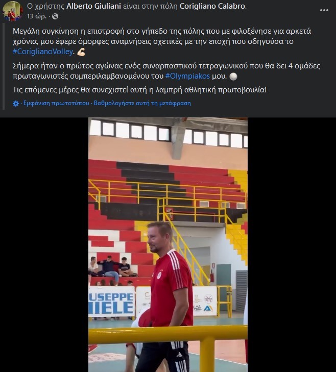 Οι «ερυθρόλευκοι» μπήκαν με το«δεξί» στο τουρνουά της Ιταλίας, επικρατώντας με 3-1 σετ την Τάραντο. Μάλιστα, ο κόουτς του Θρύλου, Αλμπέρτο Τζουλιάνι έκανε μία ανάρτηση στον προσωπικό του λογαριασμό του στα social media, σχετικά με την επιστροφή του στην πόλη που διαδραματίζεται το τουρνούα που συμμετέχει ο Θρύλος.