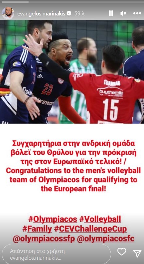 Το τμήμα Βόλεϊ Ανδρών του Ερασιτέχνη για την πρόκριση στους τελικούς του CEV Challenge Cup συνεχάρη ο Βαγγέλης Μαρινάκης.